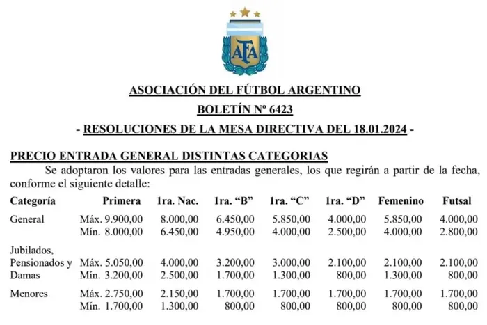La Asociación del Fútbol Argentino decretó en reunión de la mesa directiva lo que será el nuevo precio mínimo y máximo para las entradas populares en cada una de las categorías que la componen, con un aumento con respecto a los últimos precios publicados en el pasado mes de agosto.