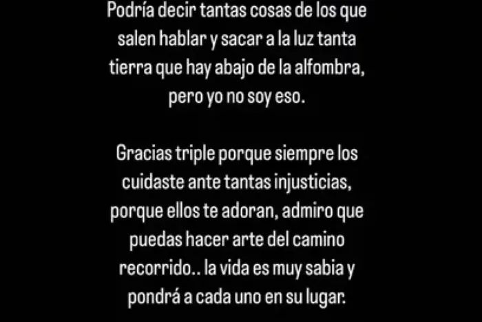 En tanto, recordó la buena actitud de Tini al momento de estar con él y sus hijos: “Gracias ‘triple’ porque siempre los cuidaste ante tantas injusticias, porque ellos te adoran. Admiro que puedas hacer arte del camino recorrido… La vida es muy sabia y pondrá a cada uno en su lugar”.