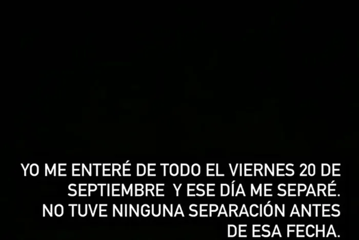 “Yo me enteré de todo el viernes 20 de septiembre y ese día me separé. No tuve ninguna separación antes de esa fecha”, escribió la modelo en sus historias además de publicar las recientes conversaciones con el padre su hija Ana.
