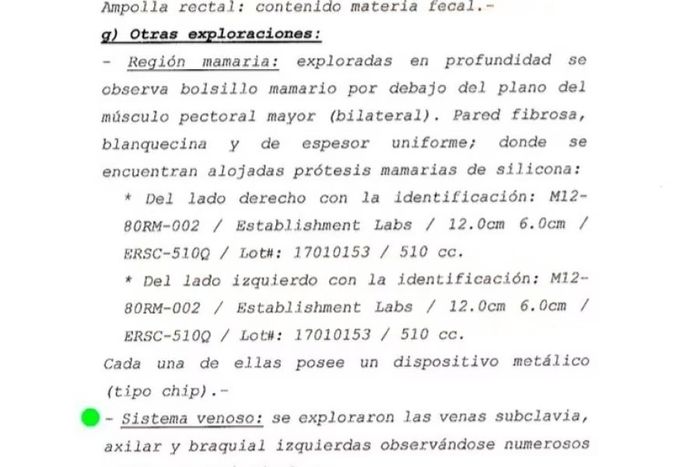 Allí, los especialistas del Departamento de Tanatología del Cuerpo Médico Forense explicaron que Silvina Luna tenía en la zona de sus glúteos “numerosas formaciones nodulares, entre irregulares hasta otras ahusadas y fusiformes, de coloración blanquecina y hasta algunas de ellas pétreas”.