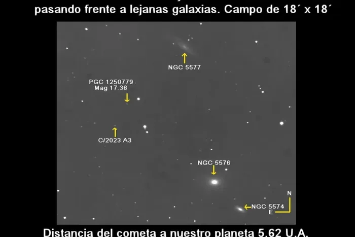 La imagen que Buso le tomó al cometa C/2023 A3 Tsuchinshan–ATLAS fue cuando la roca pasaba frente a un conjunto de galaxias espirales (similares a la Vía Láctea) en la constelación de Virgo. "Las galaxias más grandes de la foto están a aproximadamente 80 millones de años luz de distancia y las más chica, la PGC, está a más de 150 millones de años luz", explicó el astrónomo.