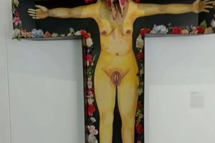 Entre las obras exhibidas en la muestra se encuentras algunas imágenes controvertidas como el cuerpo de una mujer desnuda con la cabeza cubierta martirizada en una cruz o lo que parecer ser una vagina rodeada de un manto similar al de la virgen.