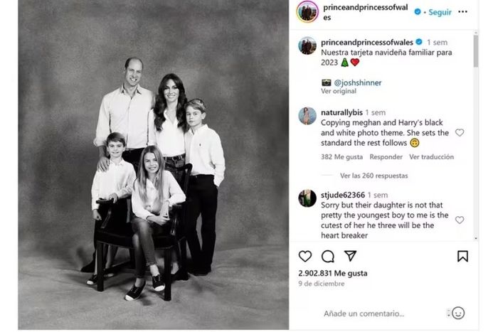 Pero, como no podía ser de otra manera, también hubo una postal navideña difundida por los futuros herederos de la corona: el Príncipe Williams, fruto del primer matrimonio de Charles Philip Arthur George y la recordada Lady Di, y su esposa, Kate Middleton. En ella se puede ver a los príncipes de Gales junto a sus tres hijos, Louis, Charlotte y George, en una prolija fotografía en blanco y negro tomada por Josh Shinner, a la que los usuarios de las redes sociales le criticaron el exceso de photoshop.