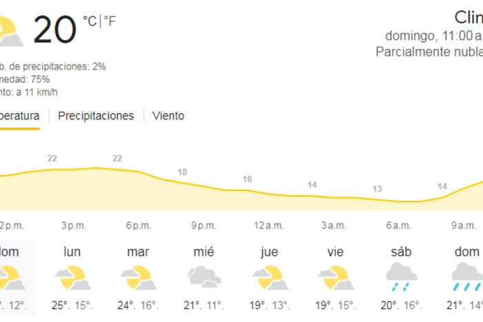 A media mañana y con una temperatura actual de 20 ºC, el cielo se encuentra parcialmente despejado. La mínima para hoy se espera que ronde los 12 ºC, mientras que la máxima alcanzará tan solo los 23 ºC.