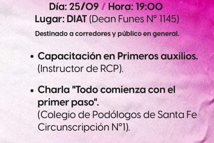 La Municipalidad de Rafaela, para el próximo lunes 25 de septiembre, organizó una jornada sobre Primeros Auxilios y Promoción de la Salud Deportiva en conjunto con diversas instituciones de la salud. La misma se realizará en las instalaciones del DIAT (Dean Funes 1145) a las 19:00. El encuentro está destinado a corredores y público en general.