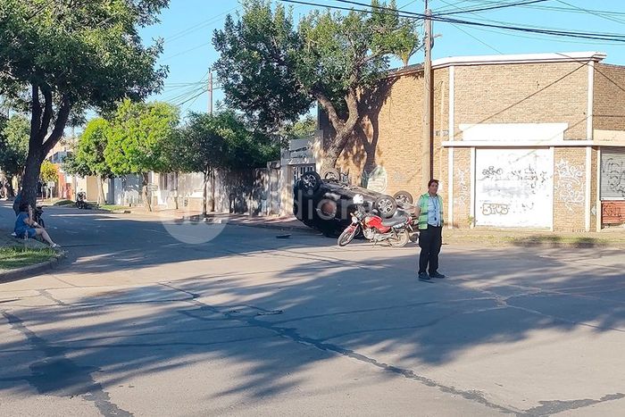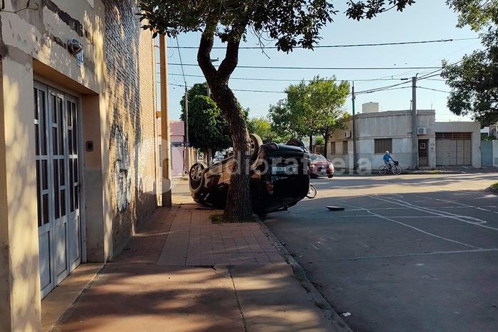 Un choque entre dos vehículos dejó como saldo un auto volcado en la esquina de Bernardo de Yrigoyen y Ayacucho, en el barrio 9 de Julio, este lunes por la tarde.